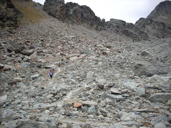 Um 10:00 Uhr wurde auf von 10 auf 0 zurückgezählt und danach wurden etwa 470 Teilnehmer bei strahlenden Sonnenschein losgelassen. Erst gab es mal geschätzte 2 km auf Asphalt zu laufen. Bald gingen diese dann auch schon Bergauf. Nach einer Viertelstunde ging es auf ein schmales Pfädchen weiter. Natürlich entstand da kurz ein Stau aber es ging sehr gesittet zu. Das Rennen dauert noch lange genug. Der 1. Berg oder besser gesagt "Col" hieß Col d'Arp (2571) und war gleich schon eine lange Anstieg. Mit angezogener Handbremse drückte ich mich hoch. Die andere drei von unserer Fahrgemeinschaft waren vor mir. Nach etwa 2,5 Stunden kam ich oben an und fing sofort mit dem Abstieg an. Diese gestalte sich als recht gut "laufbar". In die Entfernung konnte man den gigantischen Rutor-Gletscher erkennen. Das war unser nächstes Ziel. Unten nach etwa 4 Stunden als 413. in La Thuile (1435) angekommen merkte ich die Hitze wieder. Schnell mein Wasservorrat auffüllen, ein paar Kekse, Salami und Käse in den Hals gesteckt, 2 Becher Cola hinterher und sofort war ich wieder auf der Strecke. Hier hab es wieder ein Stück Asphalt aber die wenigsten liefen. Ich trottete weiter bis es wieder zu steil wurde. Hochdrücken war wieder angesagt. Erst ging's durch den Wald an schöne Wasserfälle vorbei. Nach der Baumgrenze würde der Pfad steiler und etwas unwegsamer aber immer noch recht gut begehbar. Ich kannte dieses Stück nach Refuge Deffeyes vom letztjahrigen Petite Trotte a Leon. Beim Refuge angekommen habe ich lediglich ein Bisschen Wasser nachgefüllt. Ich habe eine Startnummer auf der Brust, also sind alle andere "Gegner" :-) Weiter ging's zum Passo Alto (2857). Anfänglich war es noch gut begehbar aber bald mussten wir einige Geröll-Passagen bewältigen. Hier kommt man nicht mehr so schnell voran. Mittlerweile war die Sonne verschwunden und die Wolken versprachen nichts Gutes. Oben angekommen bin ich sofort wieder herunter. Keine Zeit um herum zu schauen.