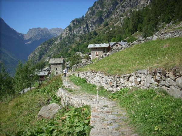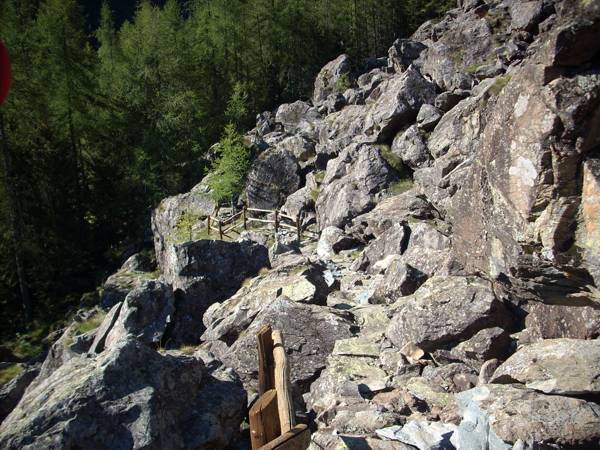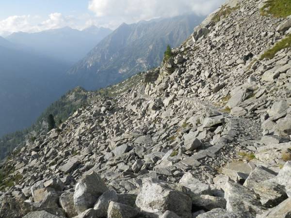 Ein Viertel Stündchen Pause in der Mittagshitze musste sein. Ich nahm eine Liege und füllte meine Trinkblase. Ein Teilnehmer gegenüber mir wurde von Sanitäter an seine Füße behandelt. Seine Füße sahen recht schlecht aus. Ich inspizierte meine Füße: Gamaschen hoch, Schuhe aus, Kompressionsstrümpfe aus. Außer Dreck und ein paar rote Druckstellen konnte ich nichts finden. Ich reinigte meine Füße und zog 5 Minuten später alles wieder an. Fünf Minuten später befand ich mich wieder auf der Strecke, diesmal eine elend unebene alte Römerstraße, bei dem man immer aufpassen muß, seine Hacksen nicht zu brechen. Nach etwa 200 hm in der Hitze legte ich mich ins Grass unter einem Baum und schloss meine Augen. Etwa ¾ Stunde später ging ich weiter. Col Lazoney (2364) ist der letzte Berg vor Gressoney, der 4. Base Vita. Immer noch müde drückte ich mich hoch. Von andere Teilnehmer keine Spur. Dann irgendwann auf halber Höhe klingelt mein Handy. Nur wenige Menschen kennen die Nummer. Merkwürdigerweise wurde ich in 10 Minuten von 4 verschiedenen Leuten angerufen die wissen wollten wie es mir ging. So ein Zufall. Ab jetzt bekommen noch weniger Leute meine Handynummer :-) Langsam kamen Wolken vor der Sonne. So ab 2000 m Höhe ging es mir dann auch deutlich besser und konnte mich an 2 Mitstreiter hängen, die mich gerade überholt hatten. Gemeinsam kamen wir oben an. Ab dort ging's aber nicht bergab. Eine lange Hochebene nach Oberloo ließ sich so gut laufen, daß ich meine Mitstreiter bald nicht mehr sehen konnte. Ich war euphorisch. Endlich ging's mir wieder gut.