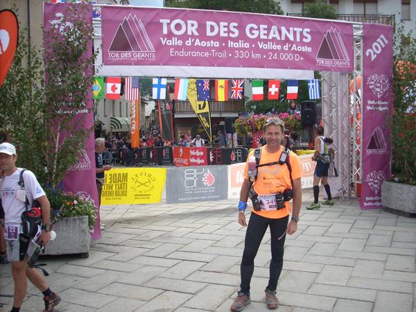 Etwas über den TdG zu erzählen fällt mir nicht schwer. Dazu gibt es einfach zu viele Eindrücke. Ich fange einfach mal an und versuche mal nicht zu sehr auszuschweifen. Im Vorfeld hatten wir eine Vierer-Fahrgemeinschaft vereinbart. Thomas, Thomas, Uwe und ich fuhren am Freitag vor dem Rennen nach Courmayeur. Auf einem Autobahnrastplatz kurz vor der Schweizer Grenze treffen wir völlig unerwartet auf Gerhard, ein TdG-Finisher von 2010. Was für ein Zufall. Er war auf dem Weg zu einem Ultra-Trail in Frankreich und wünschte uns alle viel Erfolg. In unserem Verbleib - Rifugio Monte Bianco auf 1700 üM., 5 km von Courmayeur - angekommen richteten wir uns erst mal gemütlich ein und fielen nach einem Bierchen sofort in die Heia. Samstag stand im Zeichen der Startunterlagen abholen. In Courmayeur wurde eifrig an dem Startaufbau gearbeitet. Wir gingen einkaufen und dösten im Park herum. Ab 14:00 bekamen wir dann unsere Startunterlagen (Tasche, Buff und Startnummern) und wurden mit einem Armband "gechipped". Zurück im Refugio begann ein seltenes Ritual. Wegen des schönen Wetters holten wir alle Sachen auf der Terrasse herunter und packten gemeinsam unsere Wettkampftaschen. Diese Tasche sollte Wechselkleidung, Reserve-Riegel, Schuhe und sonst noch benötigtes Zeug enthalten. Diese Taschen standen uns dann auf jede "Base-Vita" zur Verfügung. Das Rennen bestand aus 332 km und 24.000 hm, verteilt auf 7 Sektoren. Damit hatten wir also 6 "Base-Vitas" und würden die Tasche unterwegs 6 Mal sehen. Der Sollzeit für die ganze Strecke war 150 Stunden, also 6 Tage und 6 Stunden. Weil es 7 Sektoren in 6 Tage zu bewältigen gab, konnte man kein Etappenrennen daraus machen. Schlafen war also richtig einzuplanen. Samstag noch mal ordentlich gefuttert und wieder früh ins Bett, damit man auch gut ausgeruht an den Start kam. Sonntags um 09:00 Uhr waren wir schon im Startbereich um bloß nichts zu verpassen. Es wurde gelacht, fotografiert, telefoniert und jeder war die Anspannung anzumerken. Der TdG ist immerhin der längste Non-Stop-Trail der Welt, wenn auch ich solche Superlative innerlich relativiere. Es gibt genügend längere oder härtere Wettkämpfe.