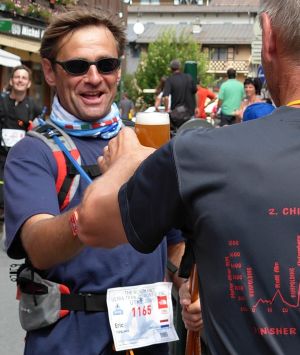 Endlich traf ich auf Jürgen Köllner. Er war den Weg ein Stückchen hochgelaufen und warnte unten die Leute per Handy, wer gerade im Anflug war. Die Straßen van Chamonix waren erreicht. In der Hauptstrasse standen die Familie Lukas und Gründling. Peter hielt sogar ein Glass Weizenbier bereit. Das ließ ich mir nicht nehmen und trank das Glas fast gänzlich aus. Noch eine Schleife durch das Zentrum von Chamonix voller Publikum. Alle Klatschten und ich fühlte mich zufrieden und erfüllt. Ich weinte aber die Zuschauer sahen lediglich meine Sonnebrille. Nach 42 Stunden, 22 Minuten und 21 Sekunden erreichte ich die Ziellinie. Gero nahm mich in Empfang und ich war platt. Auf Einmal fühlte ich überall meine Schmerzen aber es hat sich mal wieder gelohnt. Es ist und bleibt kein Suckerlecken. Zu hart ist dieser Wettkampf. Weitere Berichte: |