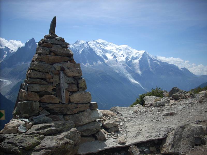 Aha, da ist der Gipfel. Oben angekommen ging es dann doch wieder weiter hoch. Ein Pfad, … ja, aber alle paar Meter von Felsen unterbrochen. Laufen ist hier eine Utopie. Ich war verärgert über meine falsche Erkundung und über diese fiese Strecke. Zum Kotzen. Mittlerweile blieb mir auch alle Kraft weg. Natürlich war das auch Kopfsache aber so merkte ich auch wie sehr meine Fußsohlen brennten. Nach einer Ewigkeit erreichte ich dann Flegere. Eigentlich wäre das letzte Teil bergab gewesen. Es ist mir aber so vorgekommen als ob es immer weiter Berauf gegangen ist. In Flegere bekam ich Cola. Drei Becher trank ich und rülpste sichtlich verärgert beim Verlassen der Verpflegung. Hauptsache nur noch bergab. Meine brennenden Fußsohlen verhinderten einen vernünftigen Laufschritt. Ich schaffte lediglich ein trottendes herumeiern. Zu unbequem waren die Schottersteine auf dem Weg herunter. Und überhaupt war der ganze Weg herunter eine Qualerei. Ich war zwar putzmunter, meine Fußsohlen waren diesen Weg herunter nicht mehr richtig gewachsen. Chamonix lag tief unter mir und kam nicht näher. Vielen haben mir hier noch überholt. Ich betrieb Schadenbegrenzung und habe mir eine "Grenze" von 20 Leutchen gesetzt. Mehr "dürften" mich nicht überholen. Immer wieder starte ich Laufversuche um sie dann beim nächste Geröllfeld oder Baumwurzelpasse wieder einzustellen.
